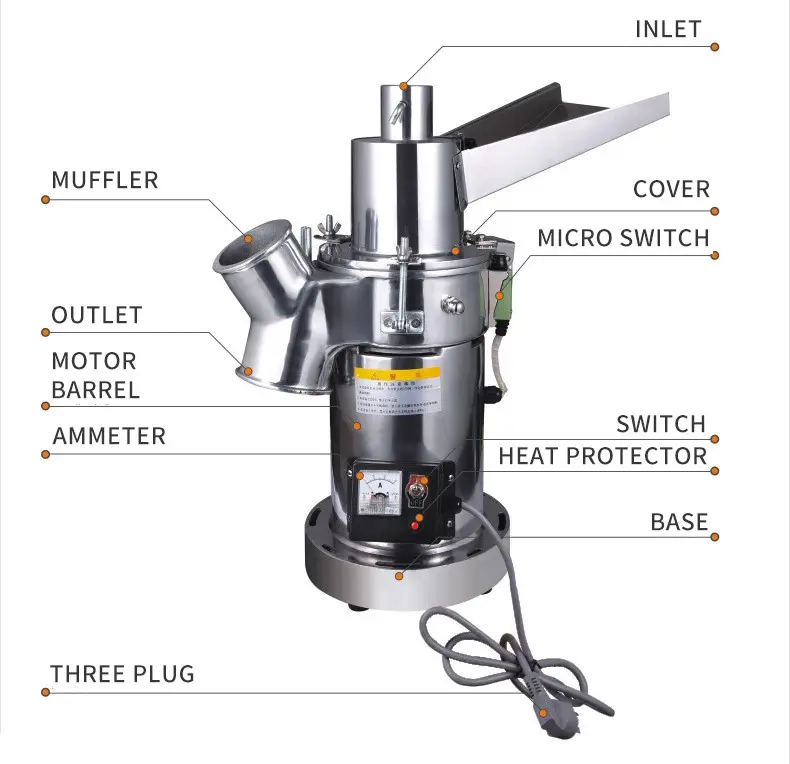 Млин ефективно подрібнює зерно, кунжут, волоські горіхи, рис, сою, боби, арахіс, кукурудзу, ячмінь, а також хімічні речовини та фарби. Тонкість помелу регулюється встановленим ситом і може варіюватися від 50 мкм до 5 мм, що дозволяє отримати продукт різного ступеню подрібнення.