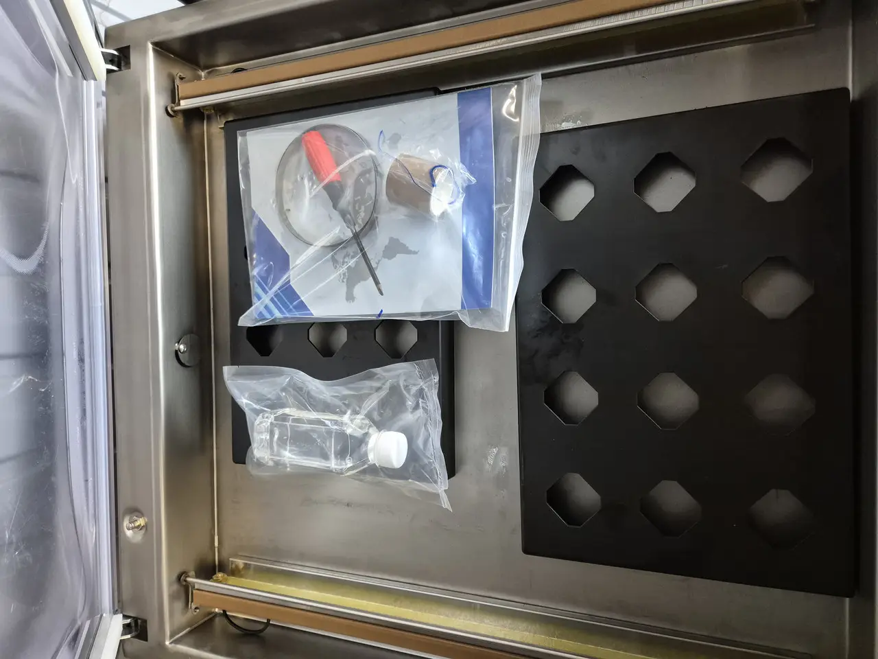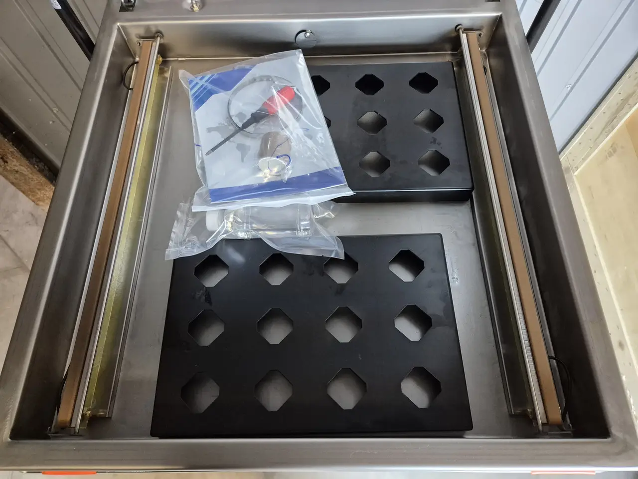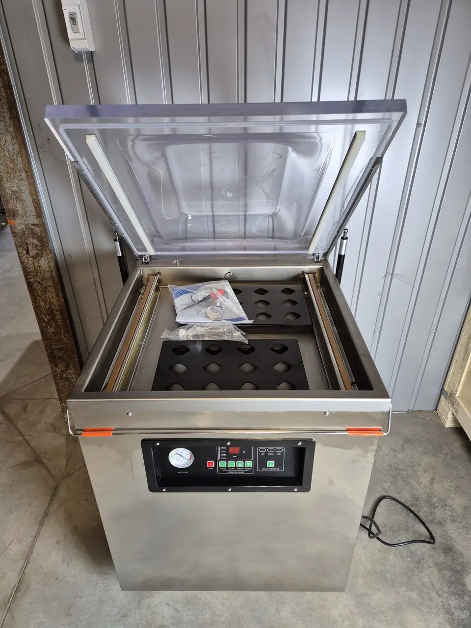 Корпус апарата виконаний з харчової нержавіючої сталі, що гарантує гігієнічність, довговічність і легке очищення. Для зручності користування у комплекті постачаються допоміжна пластина для плоских пакувань та вакуумна олива для обслуговування.