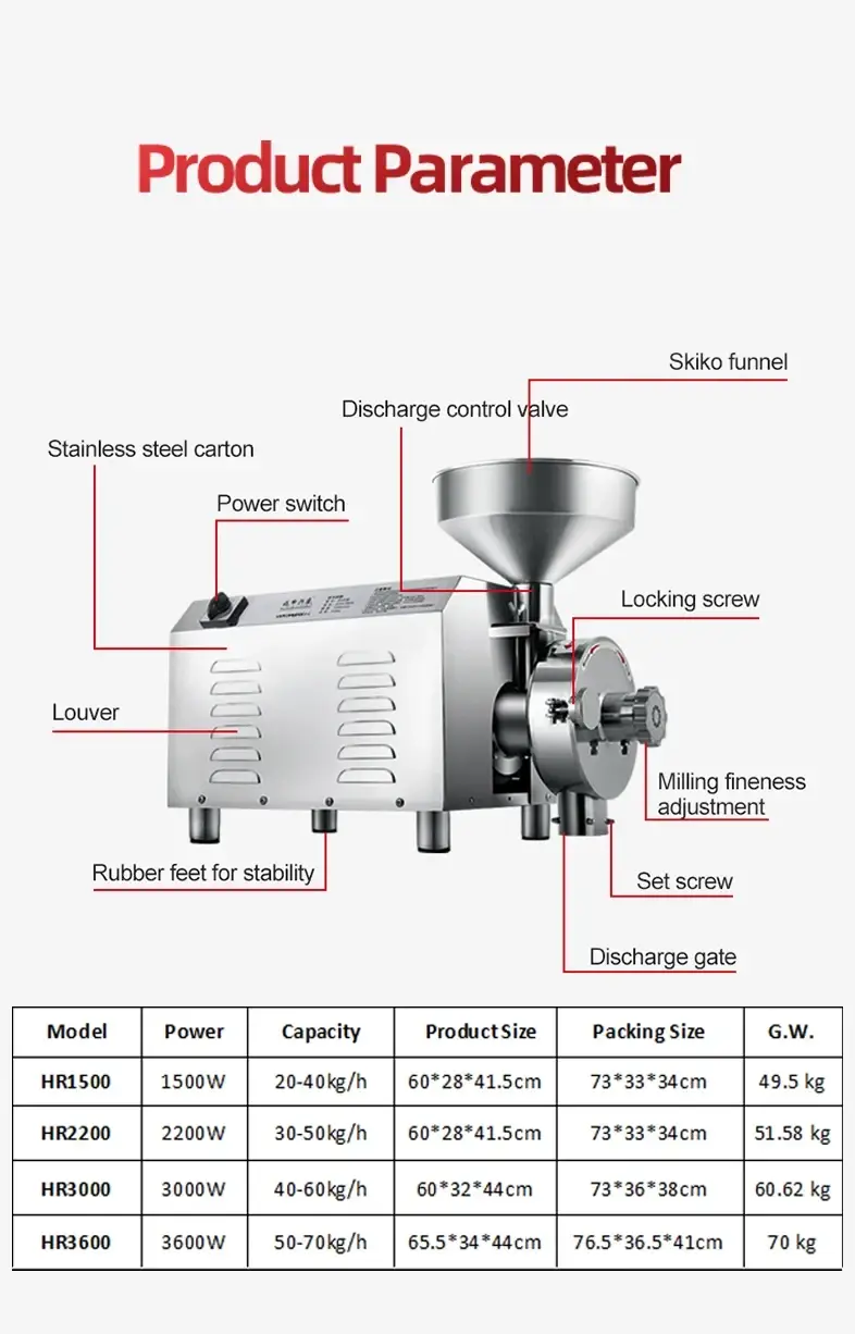 Дробарка-млин HR-2200 — високоефективний жорновий подрібнювач, розроблений для тонкого та рівномірного помелу широкого спектра сухих продуктів. Завдяки регулюванню ступеня помелу можна отримати як грубу фракцію, так і наддрібний порошок, що робить модель універсальною для різних сфер.
