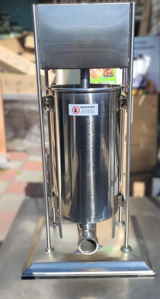 Вертикальний електричний шприц для ковбас  EVS-30L — ефективний і зручний пристрій для рівномірного наповнення ковбасних виробів. Корпус та циліндр виготовлені з високоякісної нержавіючої сталі, об’єм бункера складає 30 літрів. Поршень оснащений клапаном для виходу повітря, що забезпечує щільне та однорідне наповнення. У комплекті 4 нержавіючі насадки, плавне регулювання швидкості набивання та педаль для зупинки поршня під час роботи.