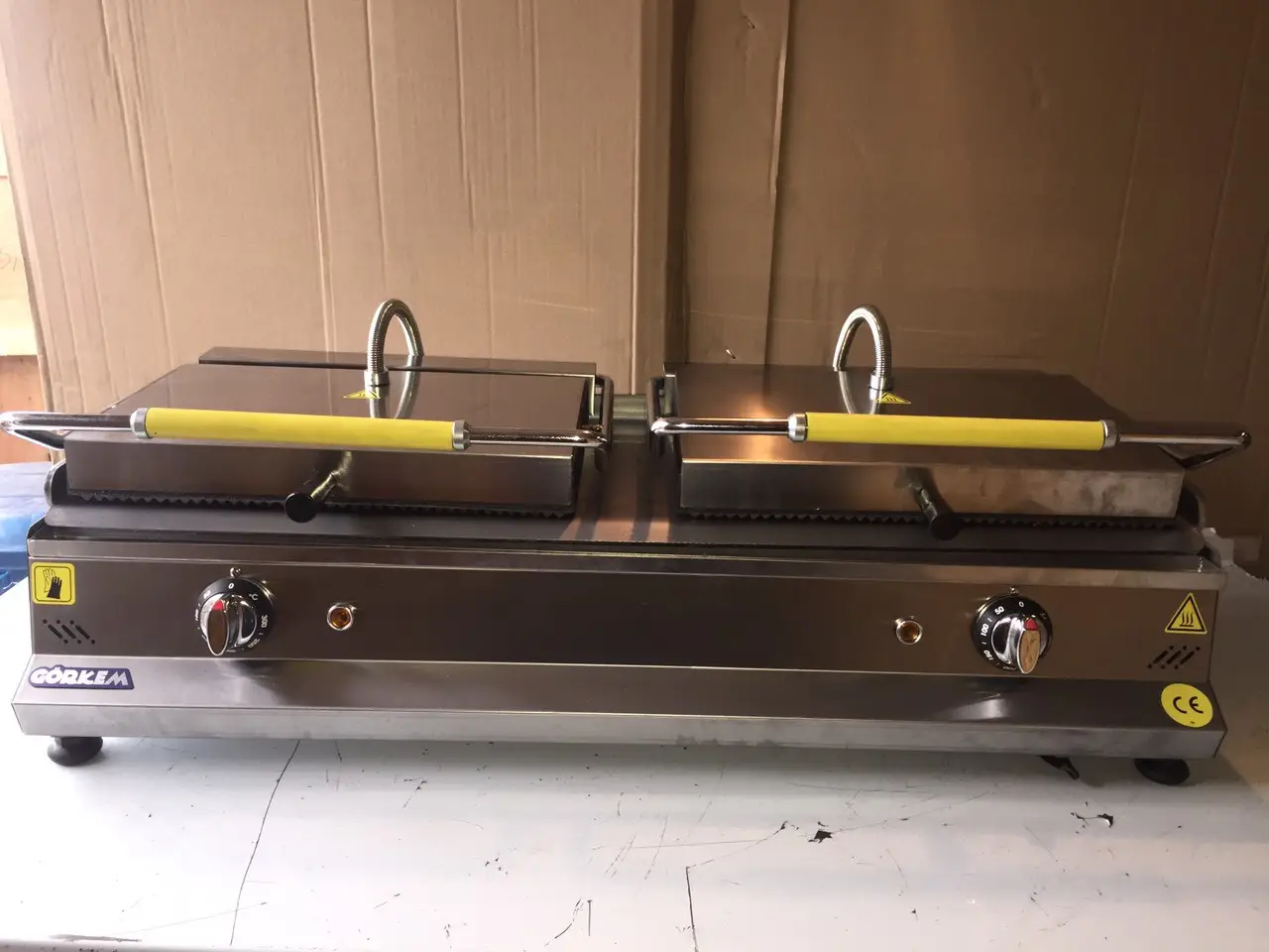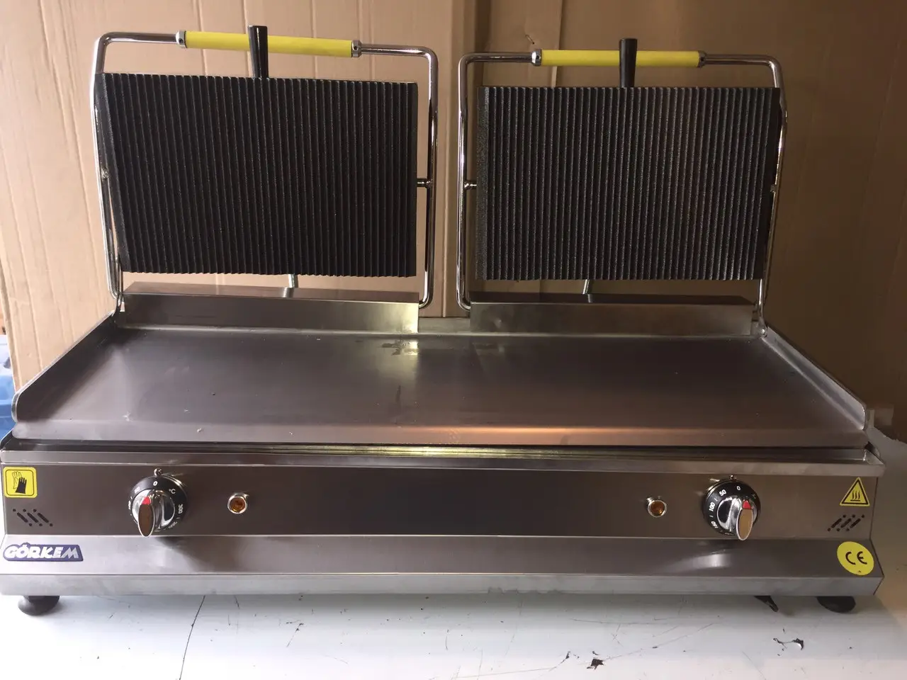 Подвійний електричний контактний гриль Görkem — професійний гриль для кафе, ресторанів та фаст-фудів. Дві рифлені чавунні верхні поверхні та гладка нижня сталева поверхня забезпечують швидке та рівномірне обсмажування продуктів. Лоток для збору жиру спрощує очищення. Діапазон температур 50–300 °C, корпус із нержавіючої сталі. Ідеальний для м’яса, сендвічів, овочів та інших страв одночасно.