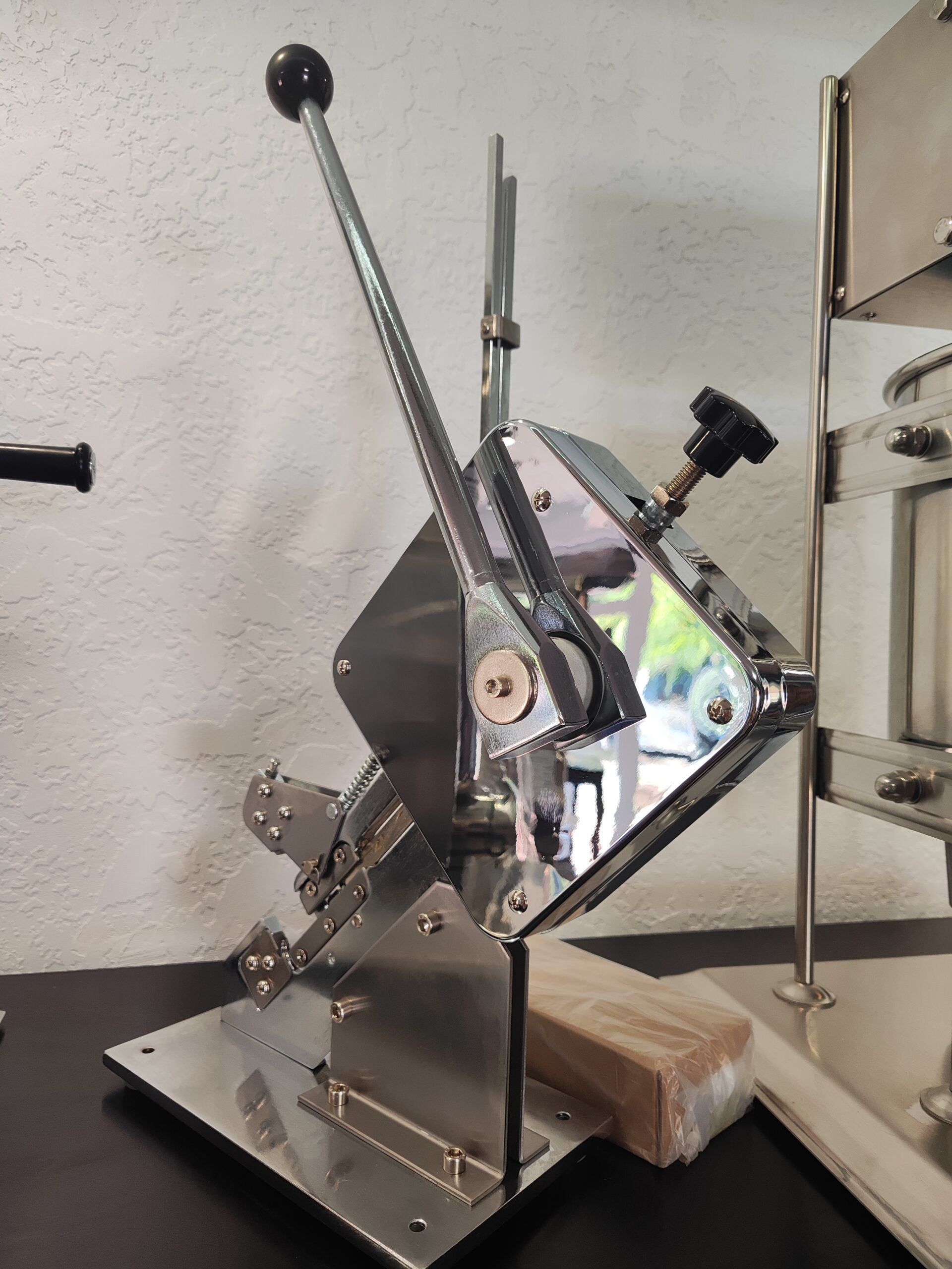 Кліпсатор встановлюється на стіл для в’язання ковбас і має міцну та продуману конструкцію. Привід здійснюється за рахунок м’язової сили оператора, яка через кривошипний механізм передається на рухомий пуансон, забезпечуючи стабільне та якісне формування скріпки.