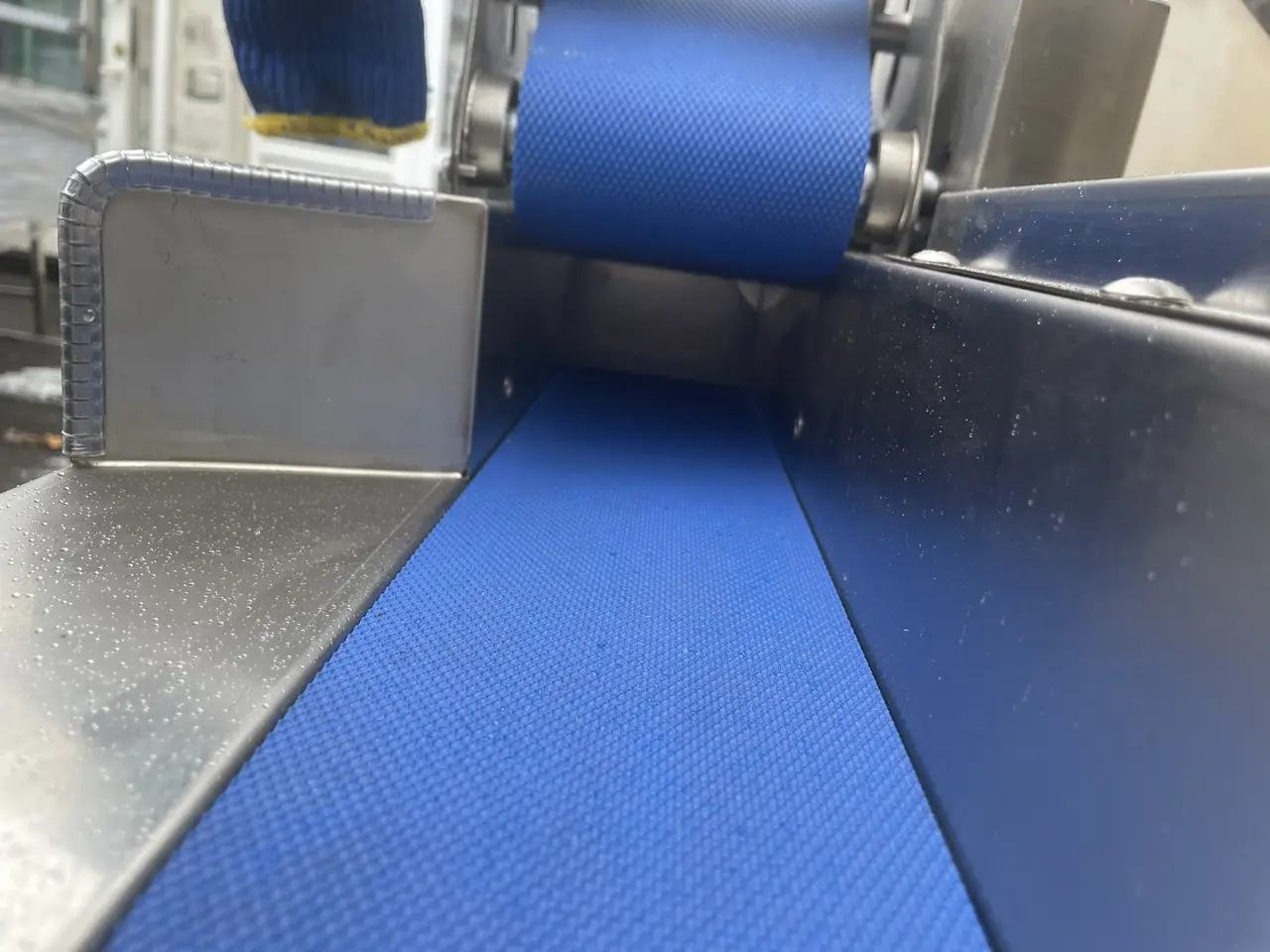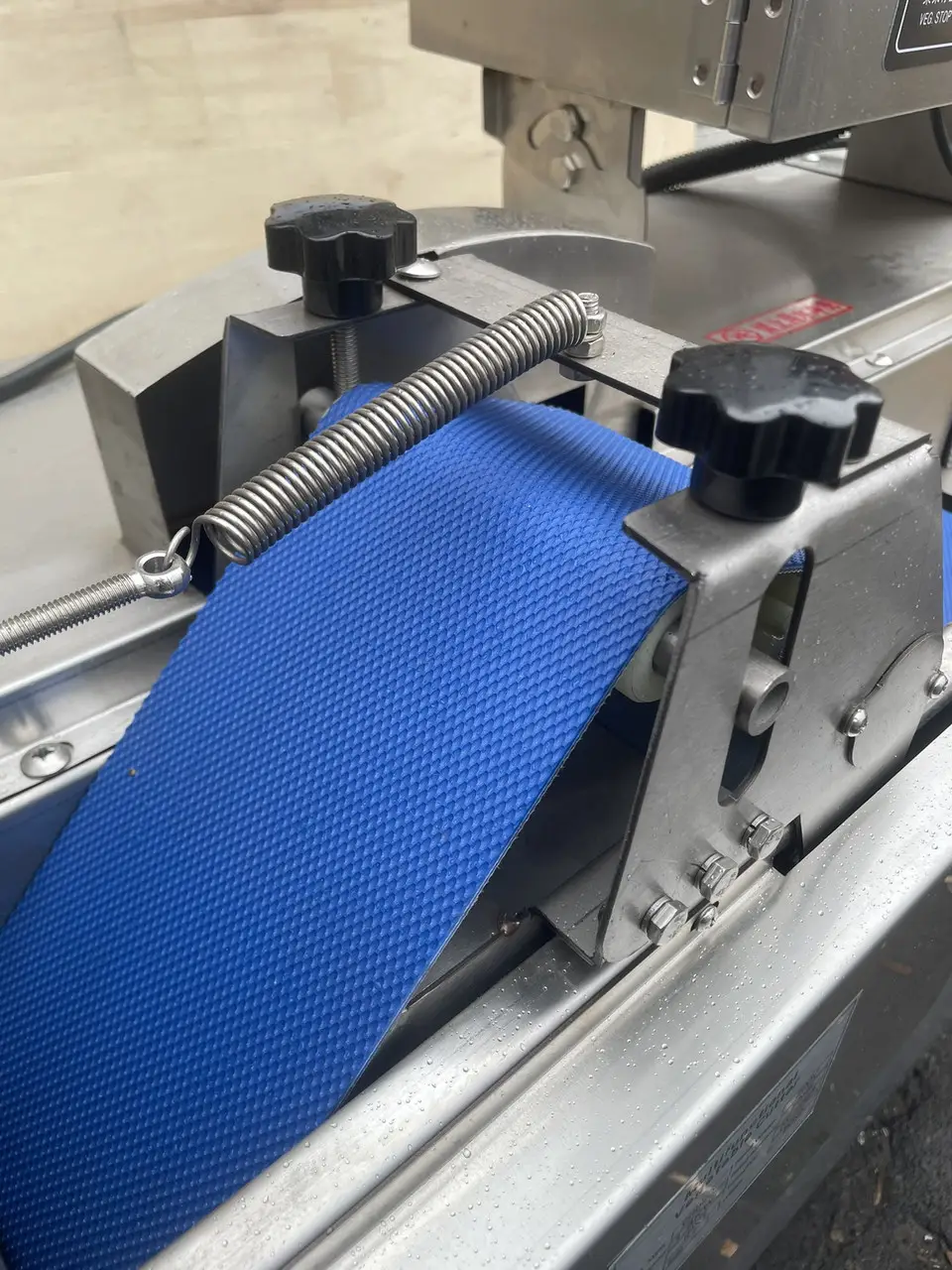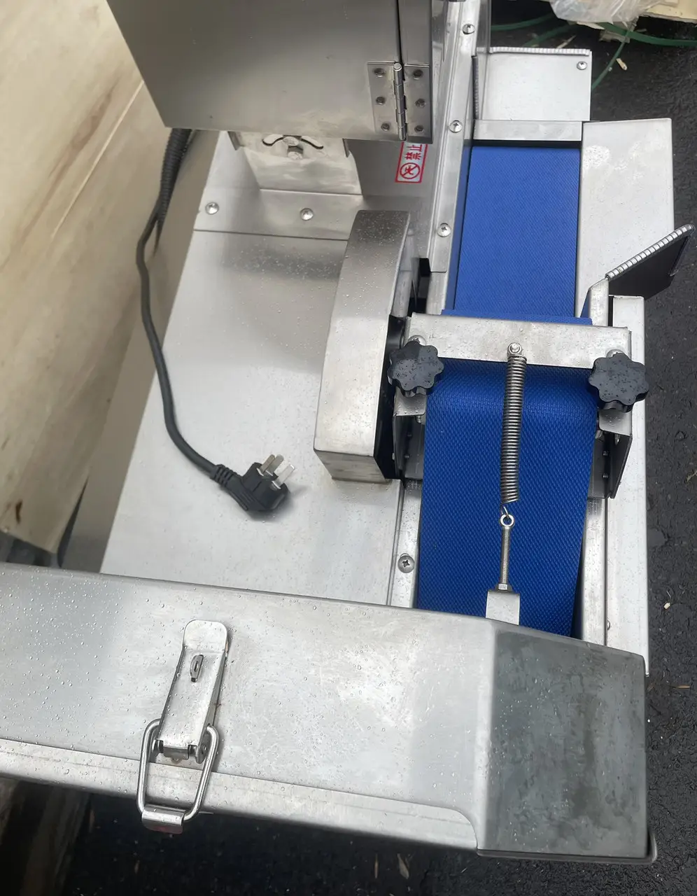 Головною перевагою моделі є рухома транспортерна стрічка з регульованою швидкістю та механізм притискання, який надійно фіксує продукт під час нарізання. Машина підтримує безперервний режим роботи, проста в обслуговуванні та легко миється. Корпус виготовлений з нержавіючої сталі, що забезпечує довговічність і відповідність санітарним нормам.