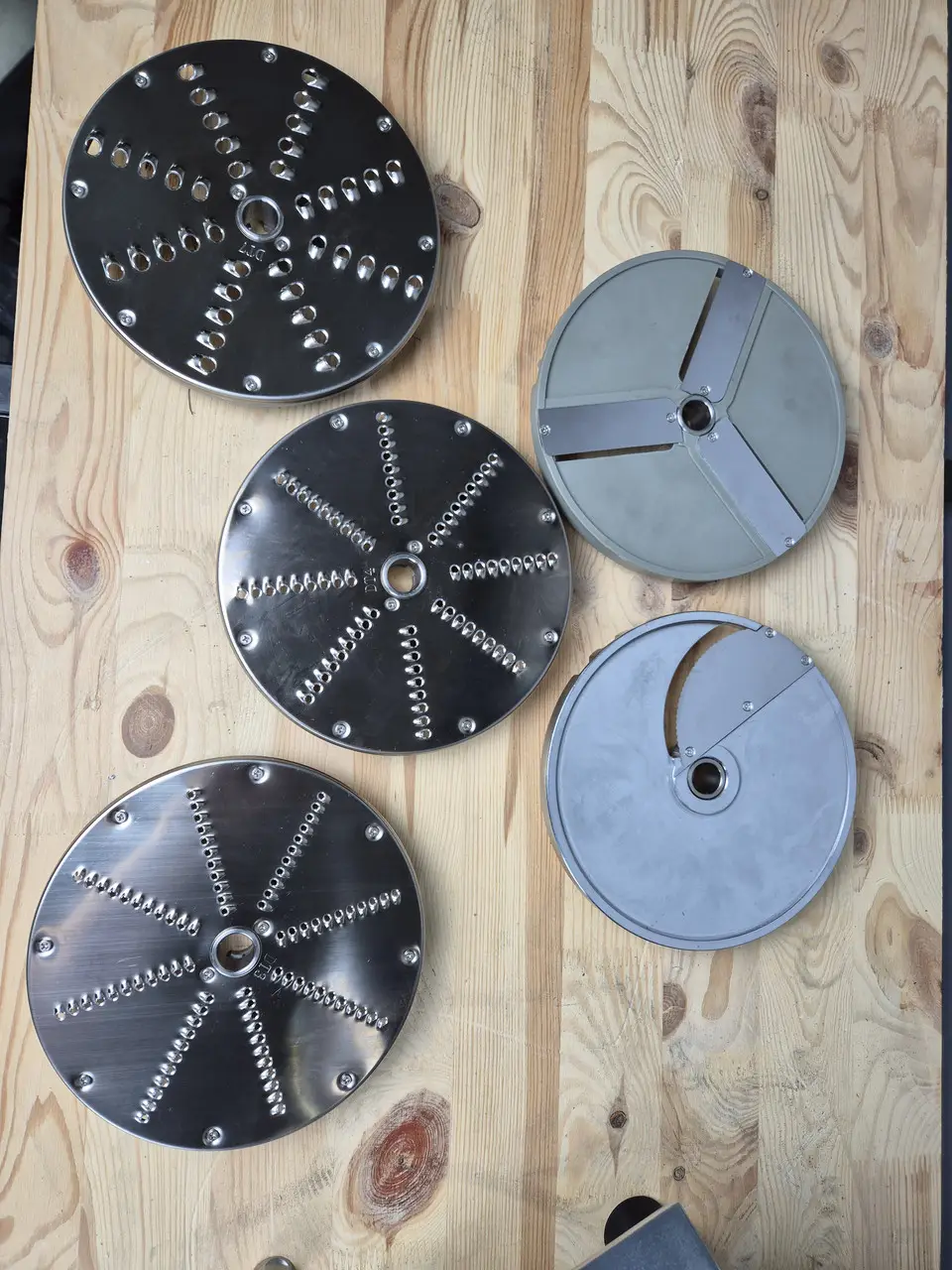 У комплекті 5 ножів-дисків: скибки 2 та 4 мм, терка 3, 4 і 7 мм;