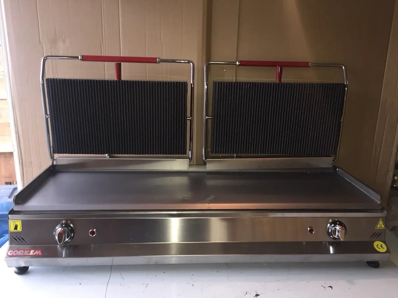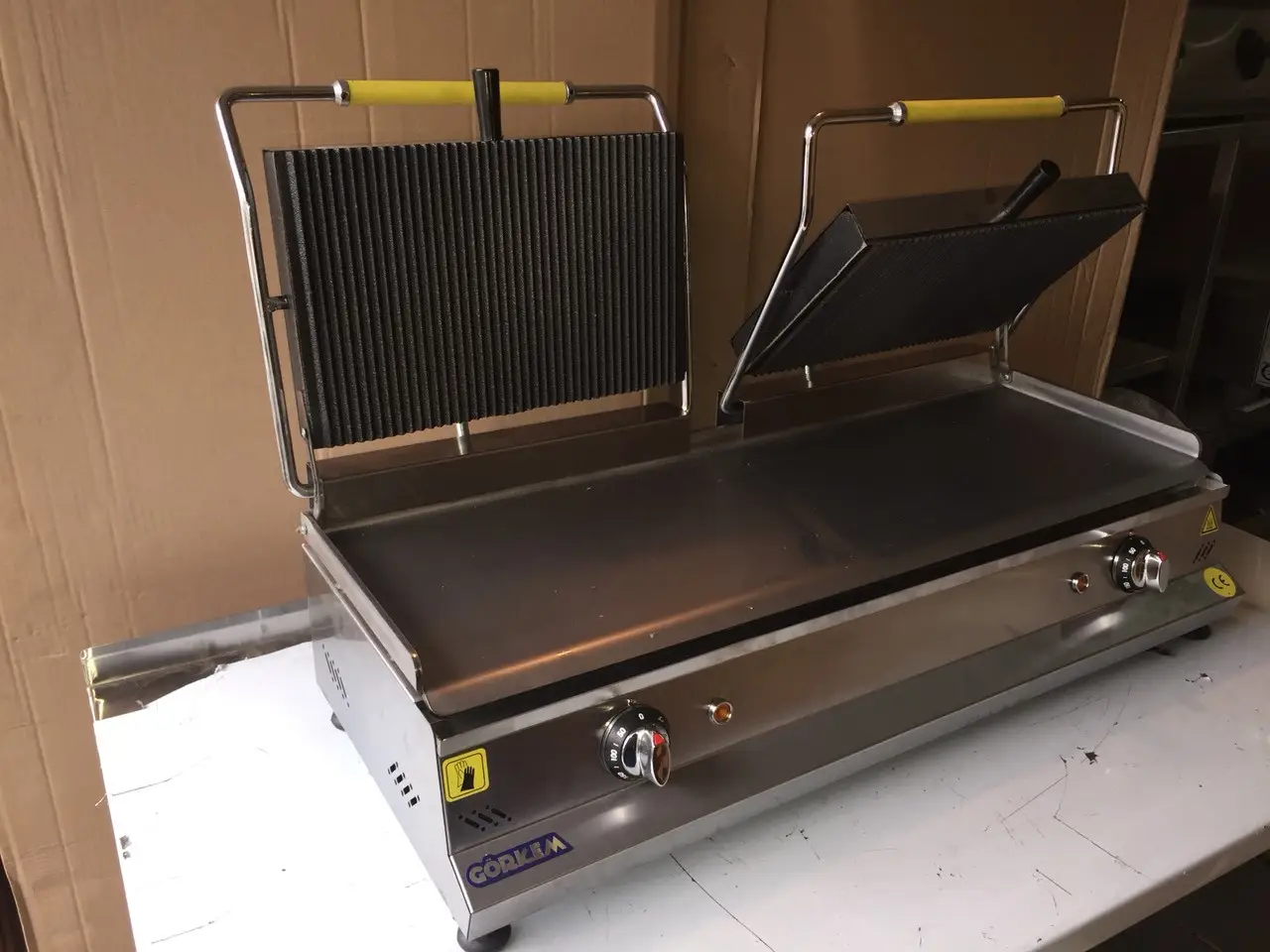 Притискний гриль Görkem — надійне та універсальне обладнання для професійної кухні. Подвійний нагрів робочих поверхонь дозволяє рівномірно обсмажувати продукти з обох сторін, створюючи апетитну скоринку та зберігаючи їхні натуральні смакові якості. Вбудований лоток для збору жиру спрощує очищення обладнання та робить його експлуатацію максимально комфортною навіть у щоденній інтенсивній роботі.