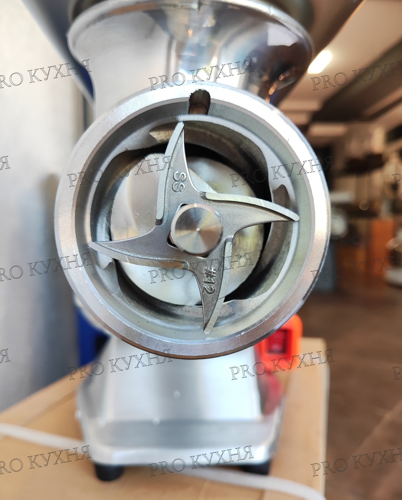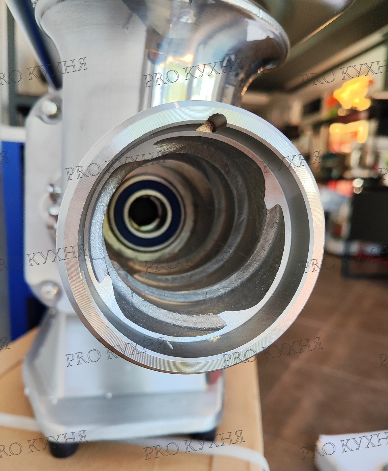 Широка приймальна горловина полегшує подачу м’яса та пришвидшує процес обробки. Головною особливістю є нестандартна решітка (як на фото), яка дозволяє отримувати фарш з унікальною структурою. Корпус виготовлений із нержавіючої сталі 304, що гарантує довговічність, гігієнічність і високу стійкість до корозії.