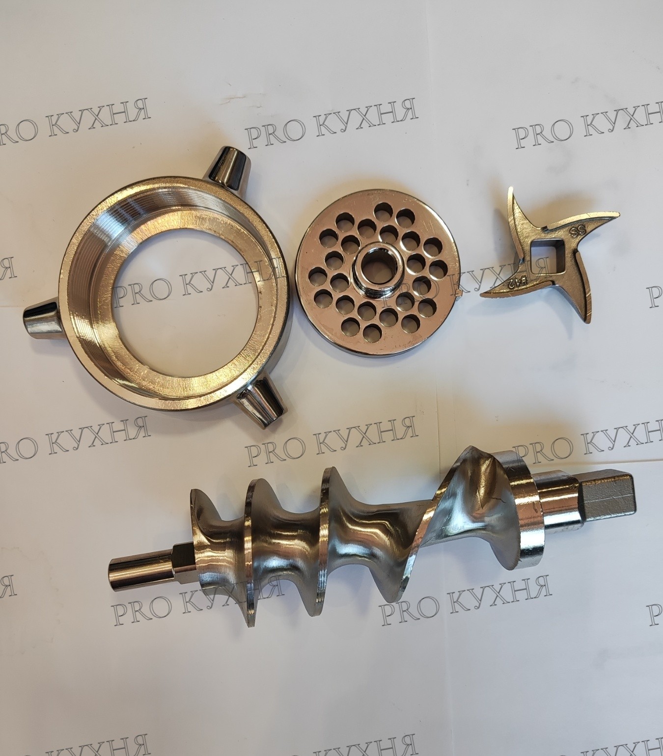 У комплекті постачаються 2 ножі, 2 решітки (6 та 8 мм), штовхач і насадка для формування ковбас, що розширює функціонал обладнання та дозволяє готувати продукцію різних видів.