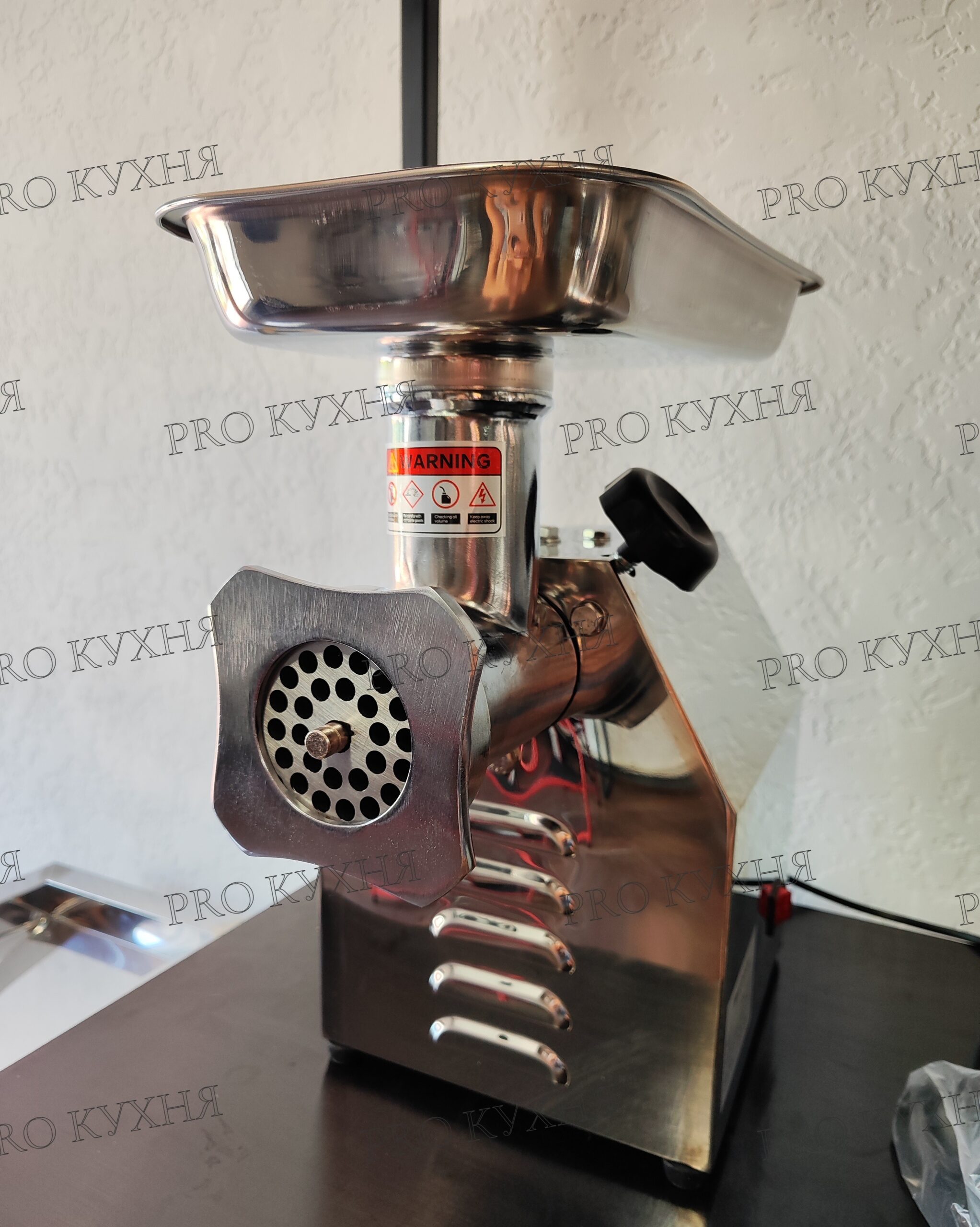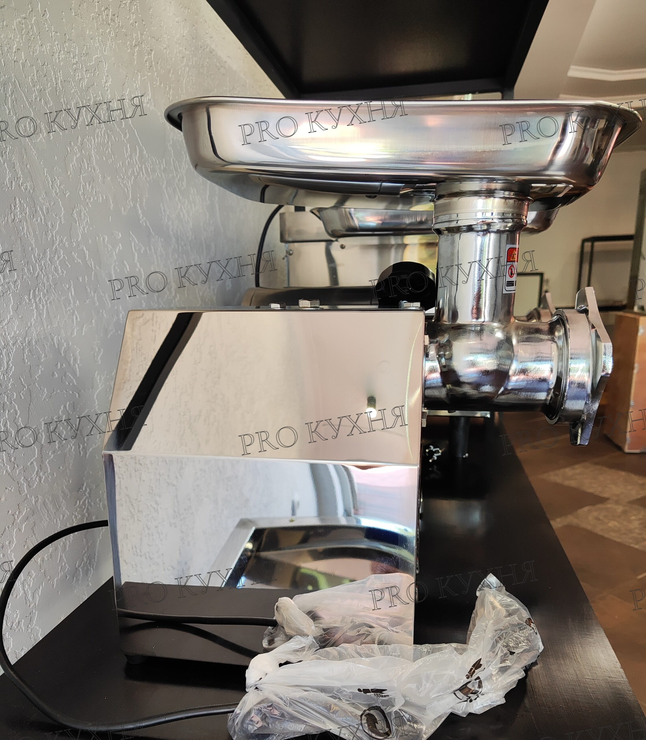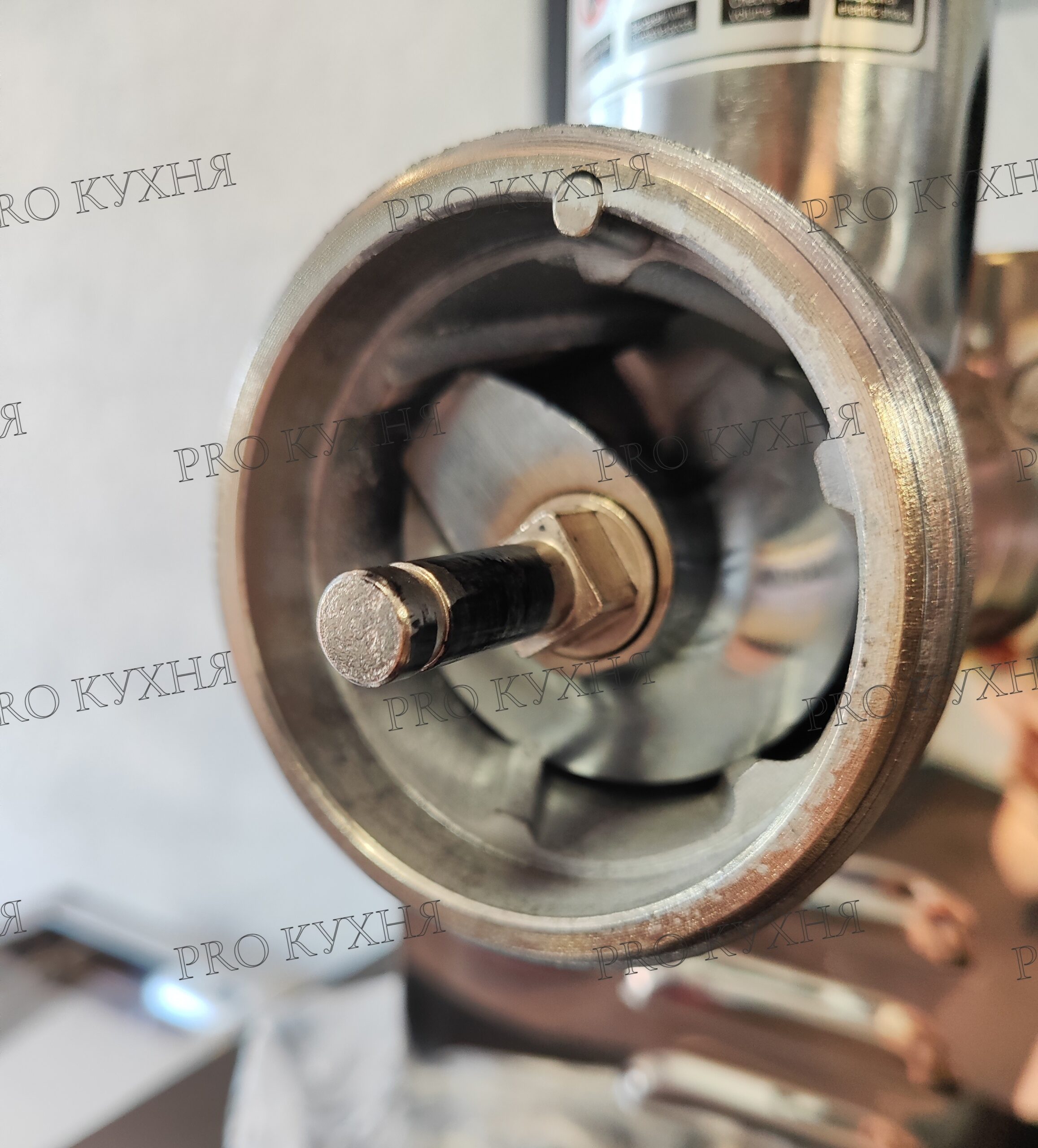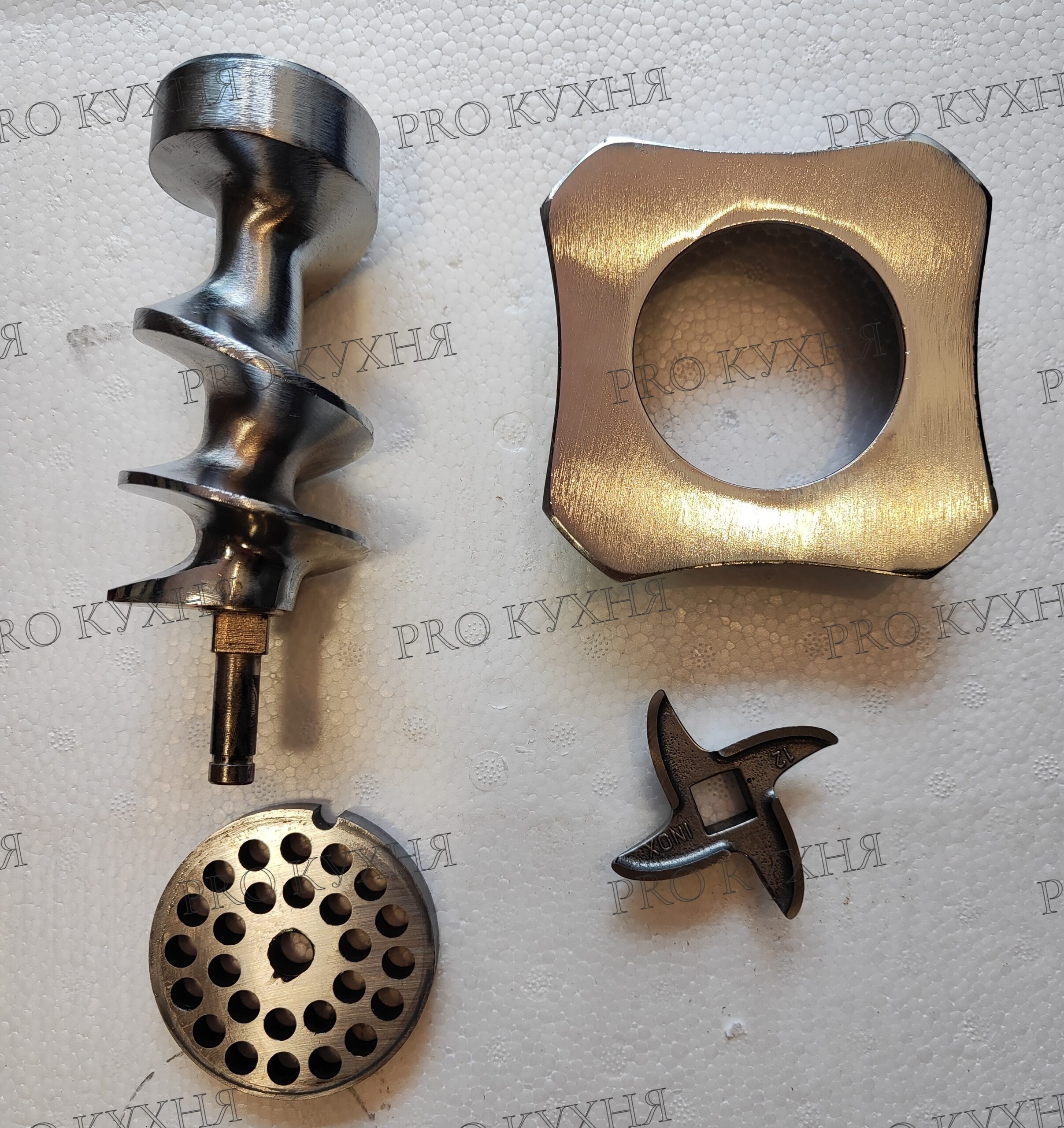Корпус виготовлений із нержавіючої сталі 304, а голова та шнек — з хромованого чавуну, що гарантує довговічність та надійність у роботі. До комплекту входять штовхач, дві решітки (6 мм та 8 мм) та два ножі для подрібнення м’яса різної консистенції.