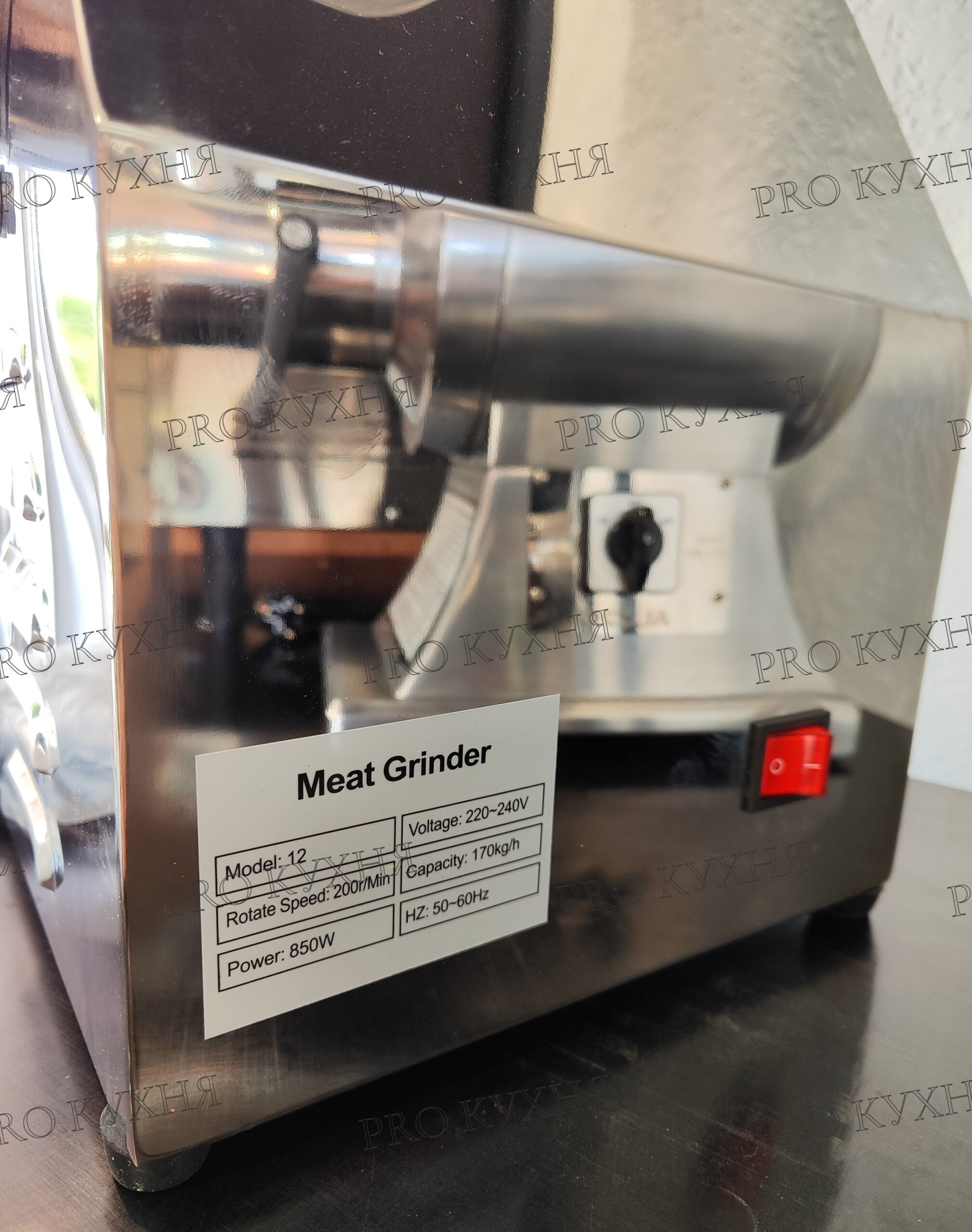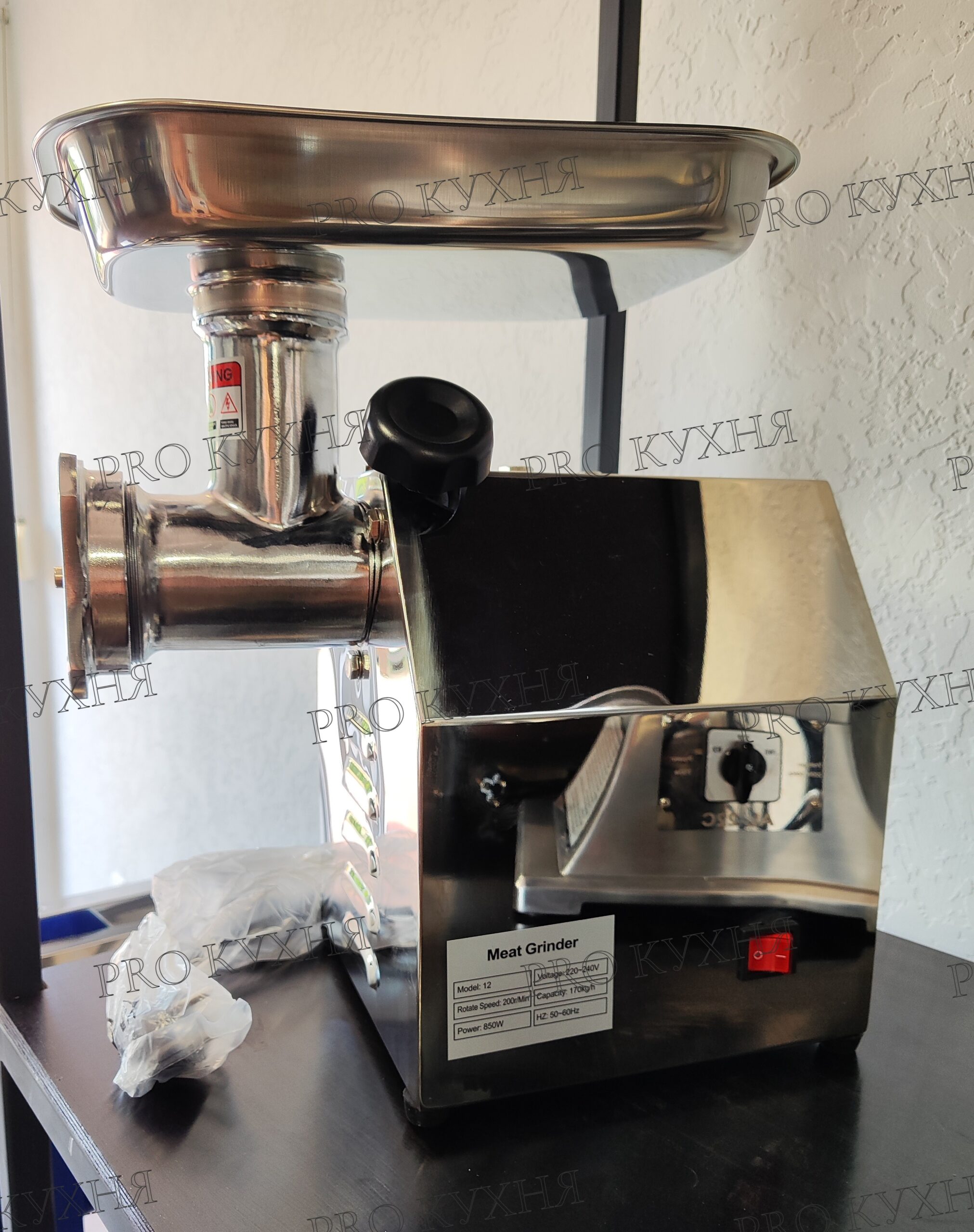 Промислова мясорубка HR-12 — надійний та компактний пристрій для подрібнення м’яса на підприємствах харчової промисловості та в невеликих м’ясних цехах. М’ясорубка забезпечує високу продуктивність до 170 кг/год, має потужний двигун 850 Вт та швидкість обертання 200 об/хв.