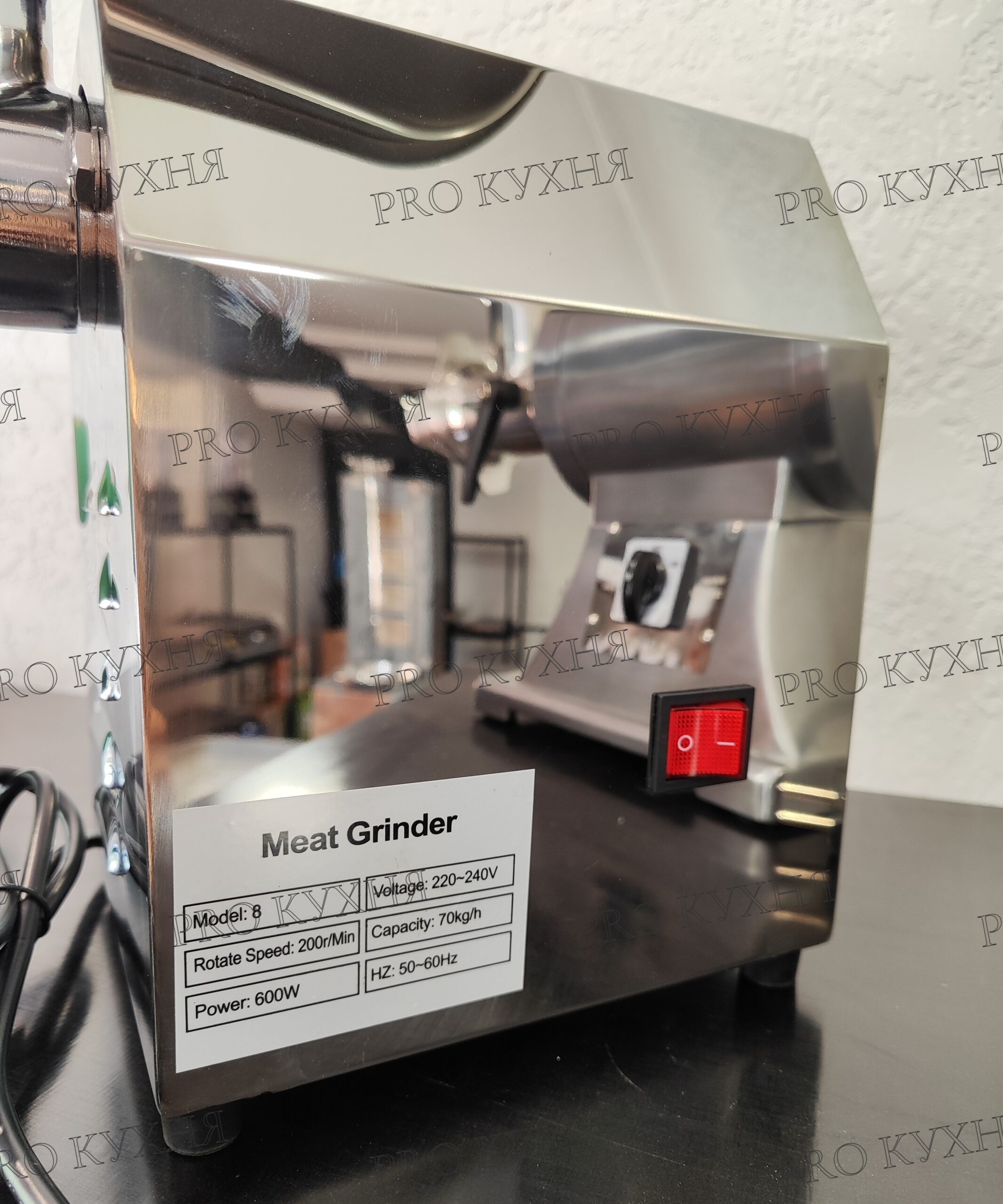 М’ясорубка вирізняється компактними габаритами 29.5 × 16.5 × 330 мм, споживає всього 0,6 кВт та працює від стандартної мережі 220 В. Швидкість обертання 190 об/хв забезпечує оптимальне перемелювання продукту без перевантаження.