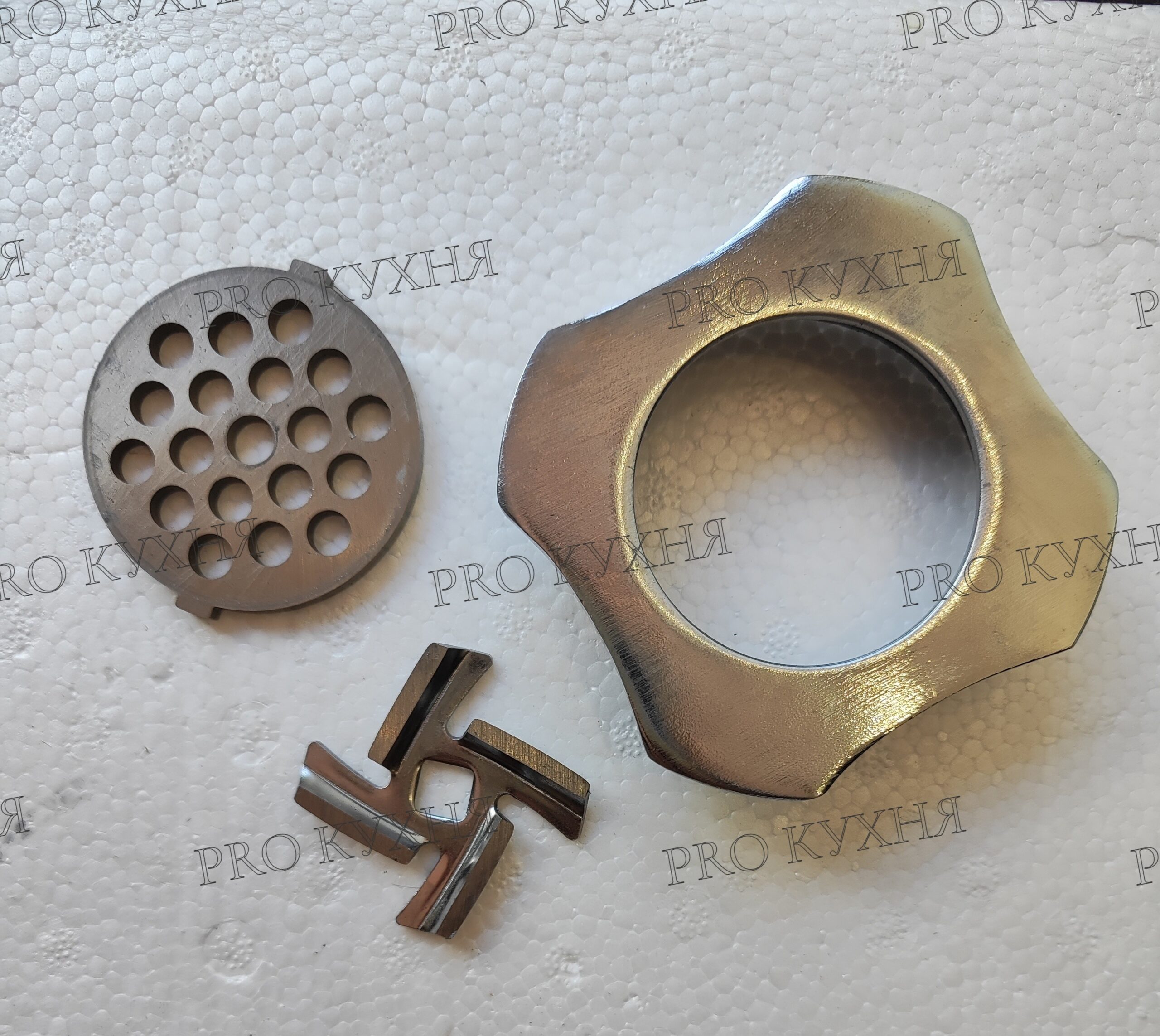 У комплект входять: насадка для виготовлення ковбас, 2 ножі, 3 решітки (6 мм, 8 мм, триочі), що дає змогу готувати фарш різної текстури.