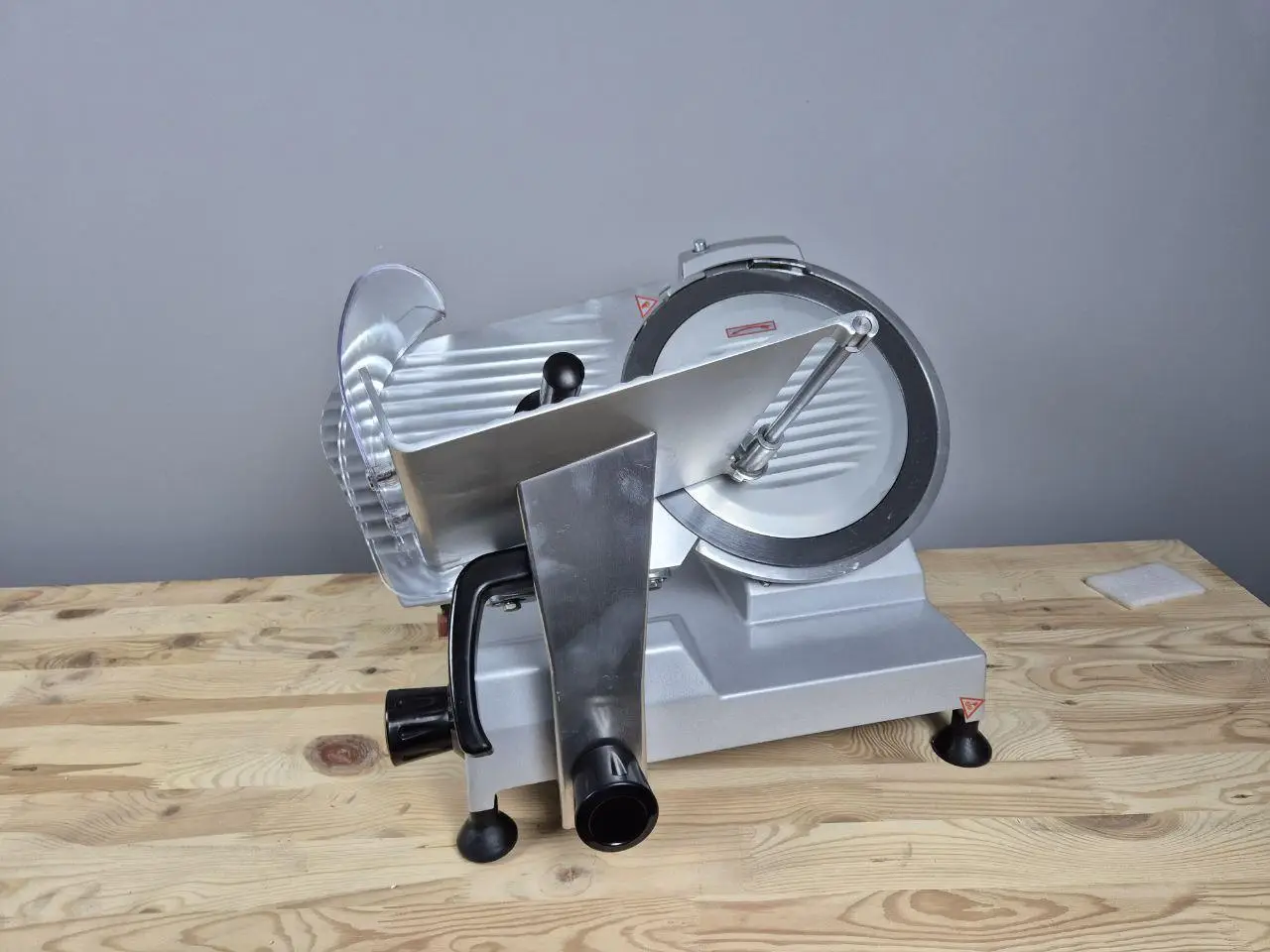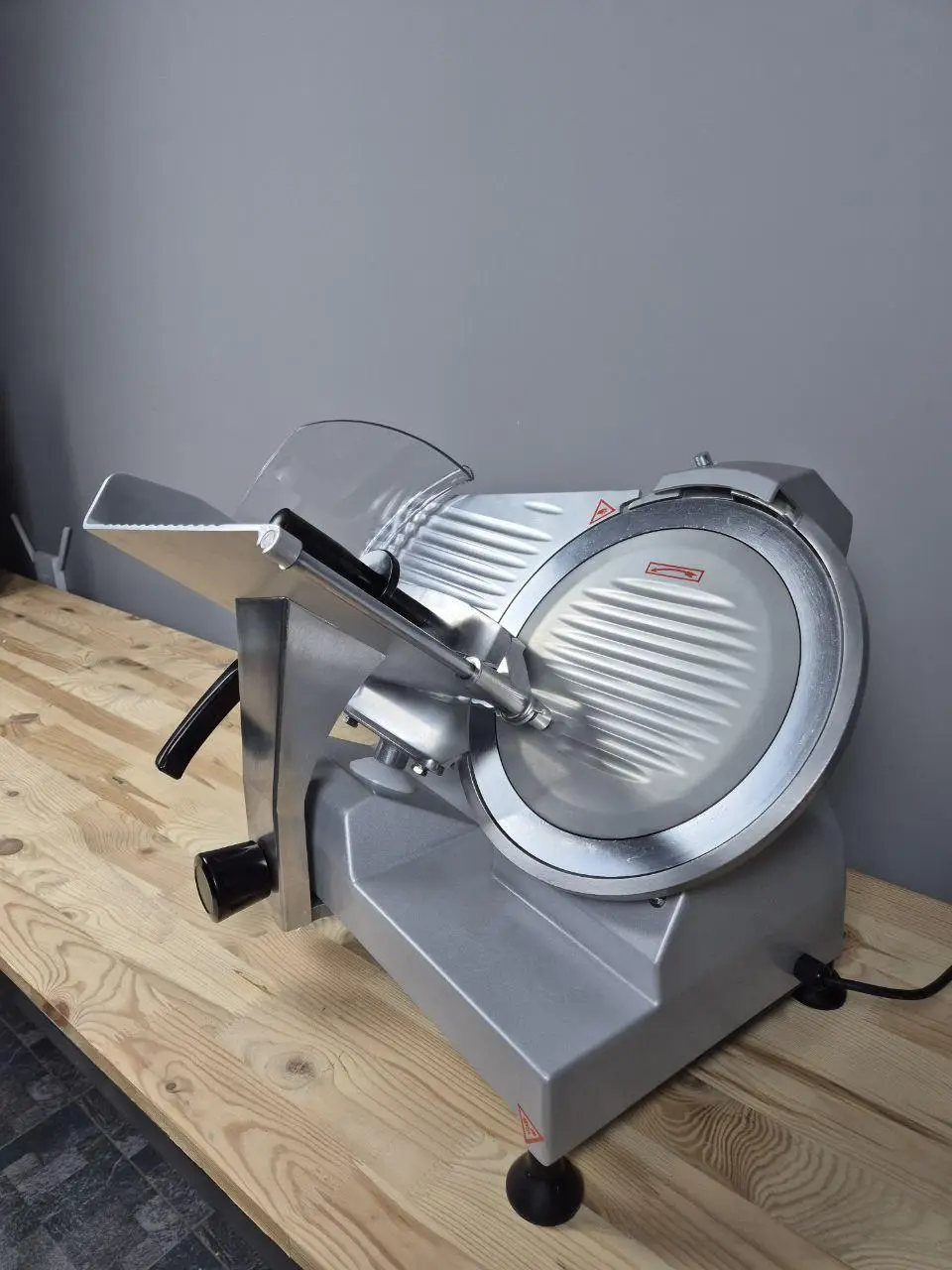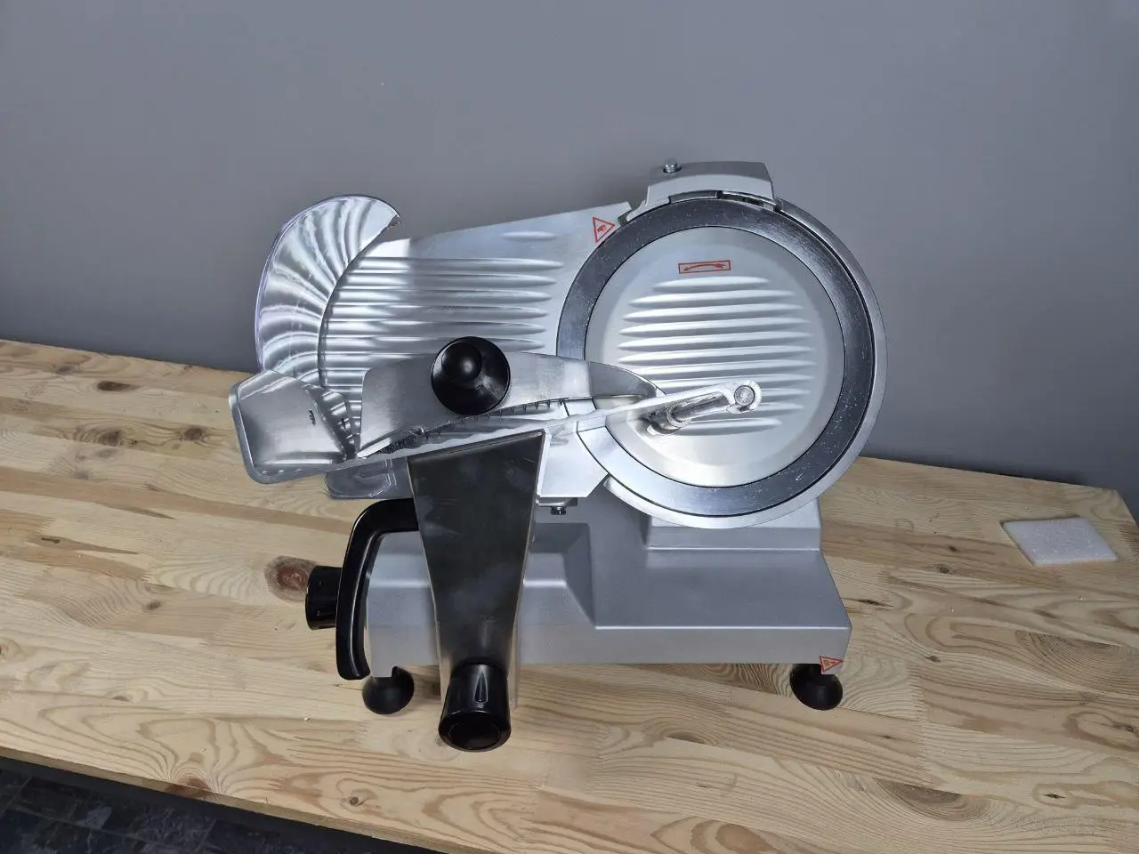 Професійний гастрономічний слайсер SZ-300A — ідеальний вибір для точної та швидкої нарізки м’яса, сирів, овочів та делікатесів. Потужний двигун, гострий ніж та вбудована система заточки гарантують бездоганну якість зрізу. Надійний корпус і стійка конструкція — для щоденної професійної роботи.