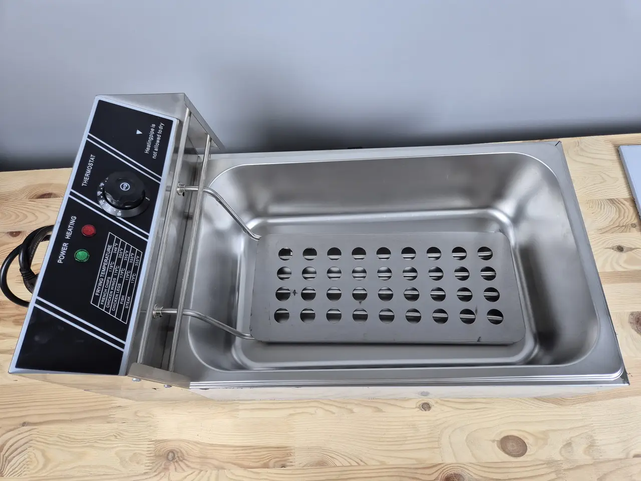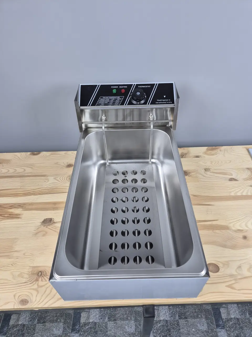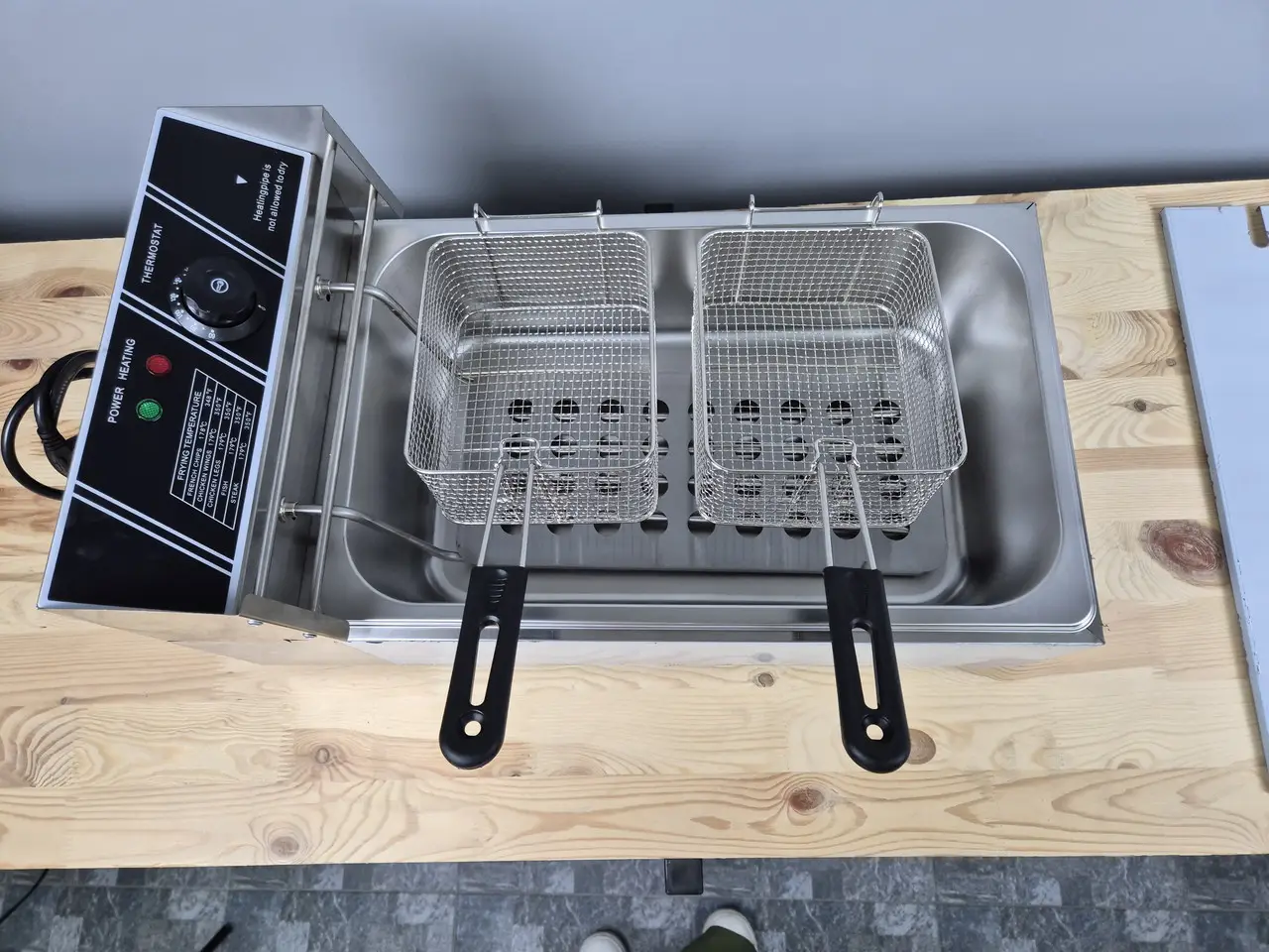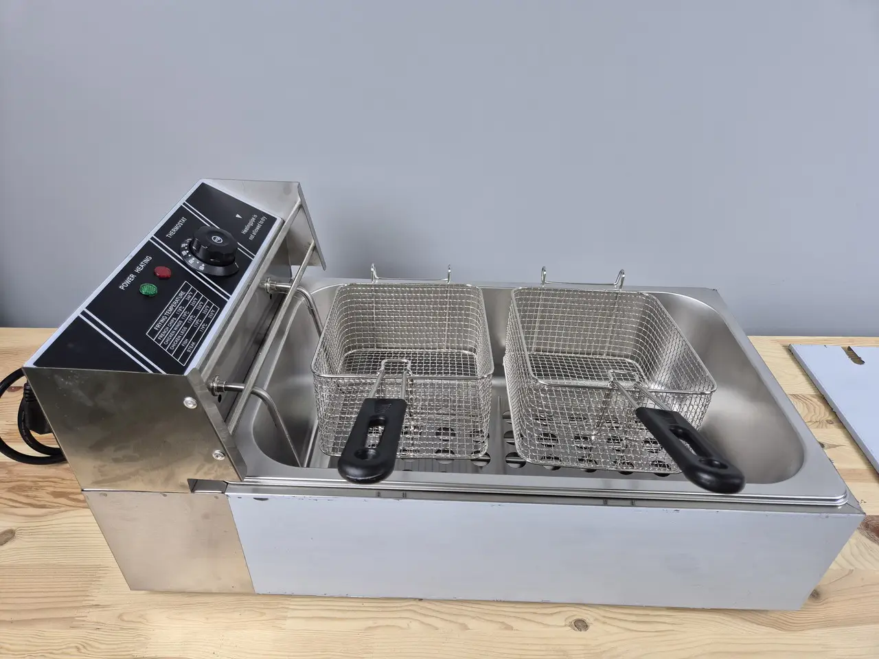 Корпус, кришка, панель керування, ванна та корзини виготовлені з високоякісної харчової нержавіючої сталі, що гарантує довговічність, стійкість до корозії та легкість очищення. Регулювання температури олії в діапазоні 60–200 °C дозволяє точно контролювати процес смаження, а вбудований датчик перегрівання забезпечує безпечну експлуатацію.